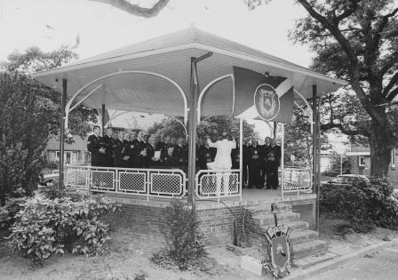 Foto: Het eerste concert sinds Dorpsbehoud eigenaar werd van de muziektent vond plaats op 3 juni 1988, het Brandweermannenkoor zong voor Simon van Dalen.