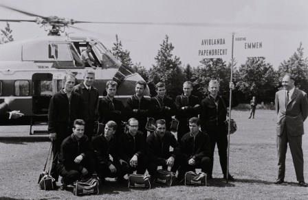 Foto: VV Papendrecht 1 per helikopter van Aviolanda naar Emmen. V.l.n.r. achter: Cor Hardam, ..?, ..?, Cees v.d.Stelt, ..van Pelt, Cor Versteeg, Piet Markesteijn. Voor v.l.n.r.: Dick van Gils, Cor Terlouw, Joop Herwig, Cees Versteeg, Bertus Ooyen. Foto: Rinus Schievink.