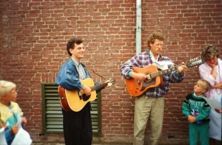 Bij de foto: Op de eerste schooldag van De Bovenkruier in 1988 werden de leerlingen met muziek naar school geleid. Links Bert Lips, rechts Ad Stam.