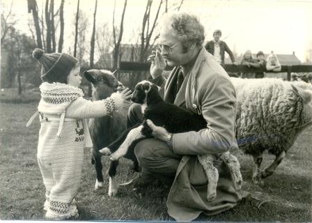 Foto: Lente hoort bij de geboorte van jonge dieren. In de lente van 1975 werd een lammetje geboren, wat hier door Cees van der Kevie getoond wordt aan een zeer geïnteresseerde peuter, Natascha van Weije.