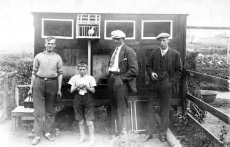 Foto: Veel Hoogendijkbewoners hielden duiven. V.l.n.r.: Frans Viveen, Teun (zoon van Frans) Viveen, Piet Viveen en Jan Viveen (vader van bestuurslid Theo Viveen).