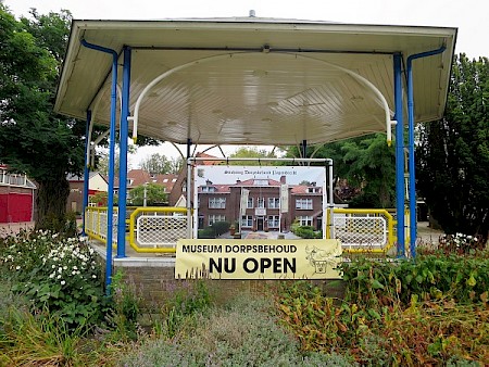Om extra aandacht te vragen voor het geopende museum was een spandoek aan onze muziektent bevestigd.