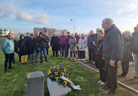 HERDENKING BIJ DE DIJKPAAL AAN DE NOORDHOEKDe dag begon om half tien ’s morgens bij de gedenk(dijk)paal aan de Noordhoek (in 2003 onthuld door Ir. J.T.W. Visser).Bloemen werden gelegd door Mevrouw Jetten en namens Dorpsbehoud door Theo Viveen (die het mozaïek bij de waterbushalte heeft