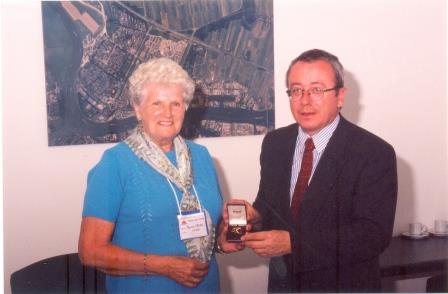 Foto: In 1995 kreeg Marie Child van toenmalig burgemeester Bandell een mooie speld van de Gemeente Papendrecht. In 2015 droeg dochter Linda die zorgvuldig bewaarde speld van haar in 2005 overleden moeder.